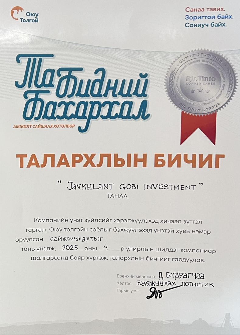 "Шилдэг Түншлэгч"-р ЖАВХЛАНТ ГОВЬ ИНВЕСТМЕНТ ХХК шалгарлаа.
